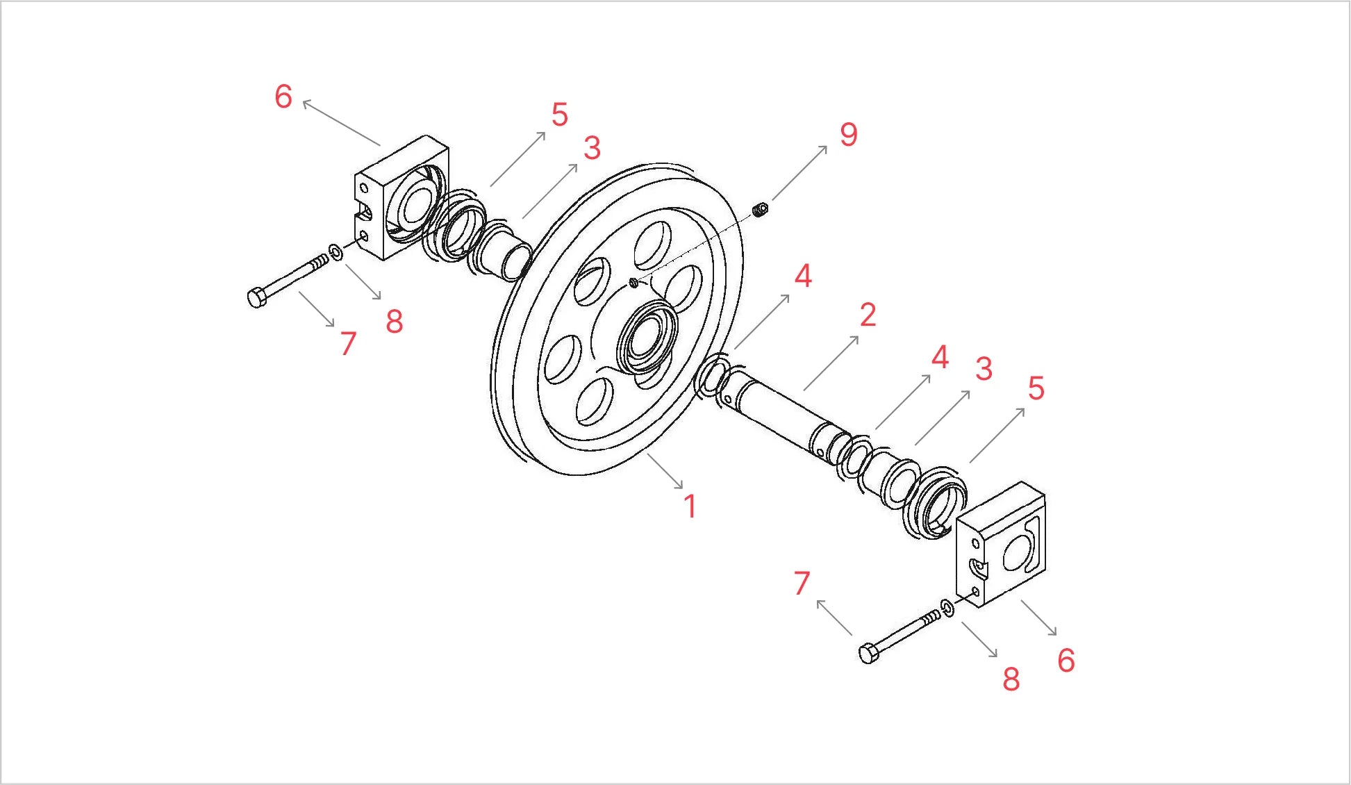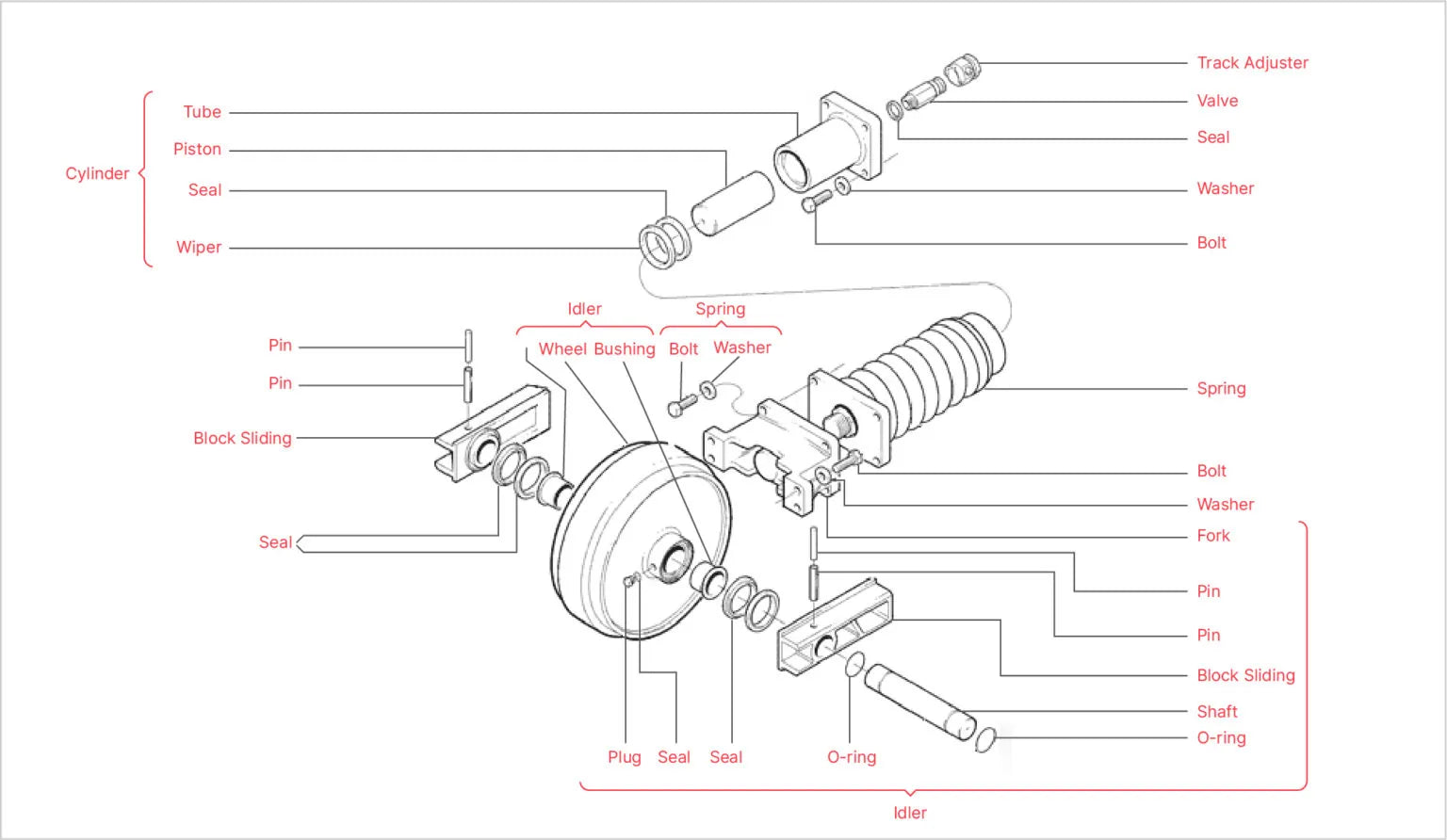 Since excavators usually stay stationary and don’t cruise over challenging terrain, they can rely on a single-flanged front idler.