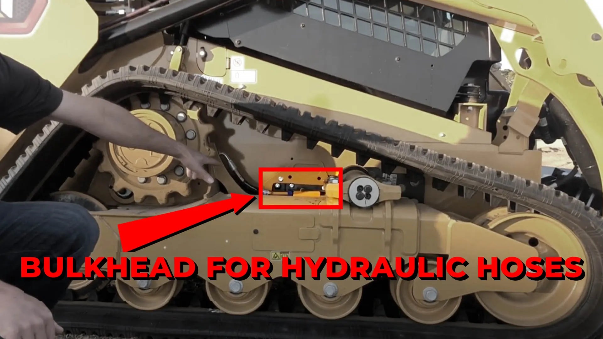 The final drive hoses on the 259D3 have a new routing. Instead of coming out from the belly through a rectangular opening, there’s a plastic bulkhead. It prevents dirt, mud, and debris from getting into the machine’s belly—a constant problem on the 259D.