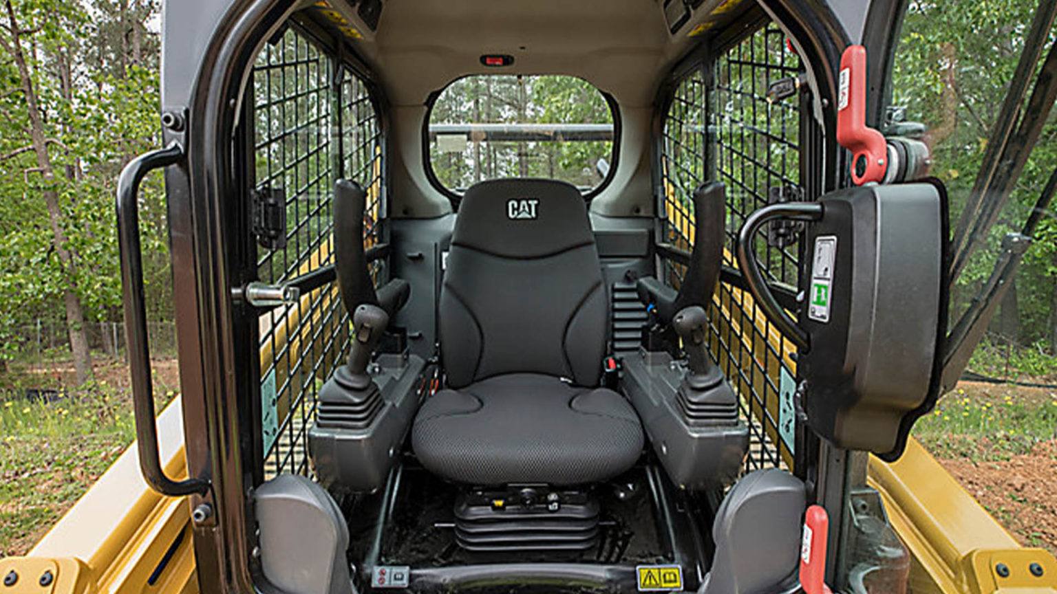 A nice detail from Cat is the high-vis safety features, which help you recognize them quickly. The hydraulic arms lockout, emergency door releases, and the ceiling tab—to lower the arms in the case of a dead engine—are all red. The seat belt is high-vis orange, so you can clearly see from the outside if the operator has it on.