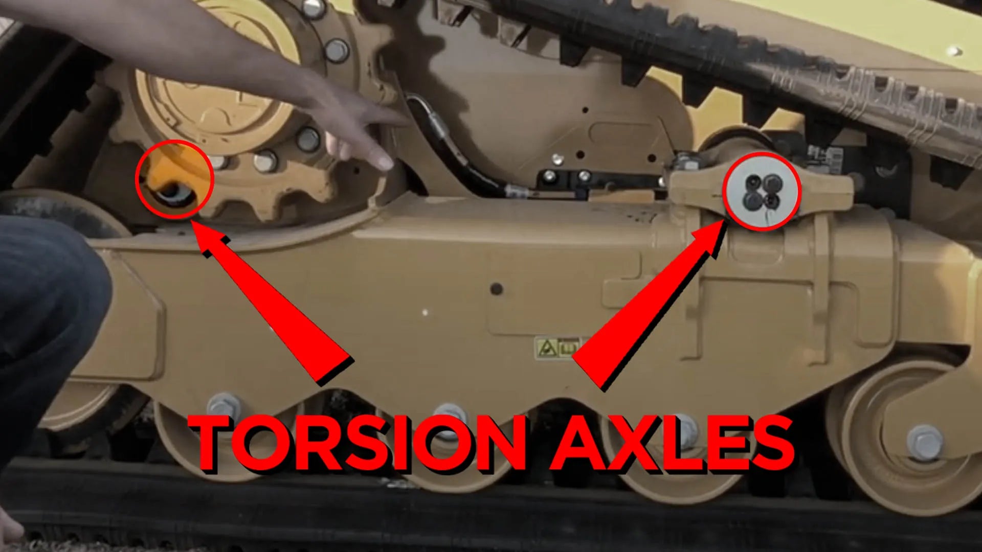 While most compact track loaders have rigid undercarriages, the 259D3 has torsion axles for independent side-by-side track suspension. They are similar to torsion arm trailer axles, where an inner steel bar rotates against four rubber cords.