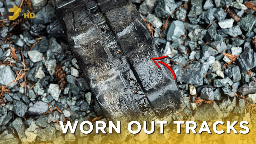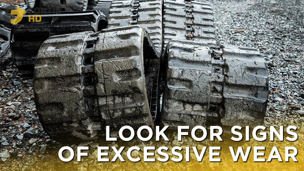 Inspect the rubber track’s underside for stress marks, wear, or abnormalities, such as low tread depth, cuts, and uneven wear due to misalignment.