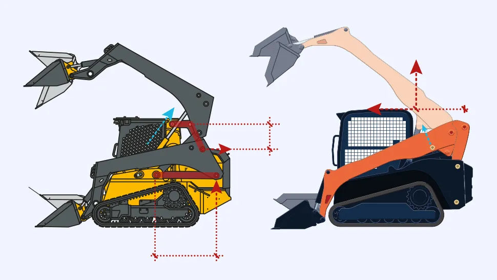 In contrast, the John Deere 333 G’s double pivot points allow it to use both decomposed forces efficiently to rotate the boom arms and lift the bucket.