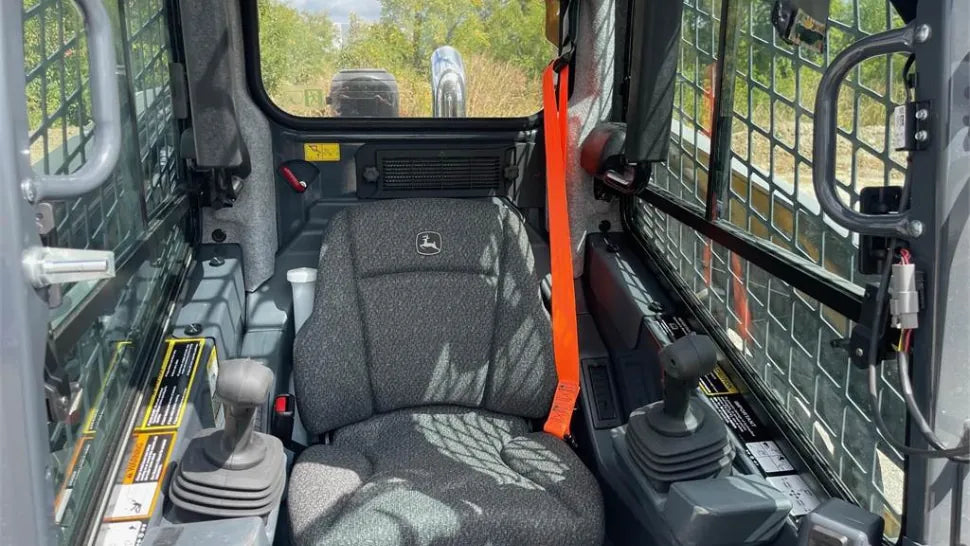 The John Deere 333G seat, HVAC, switch layout, and controls contribute to the operator’s comfort.
