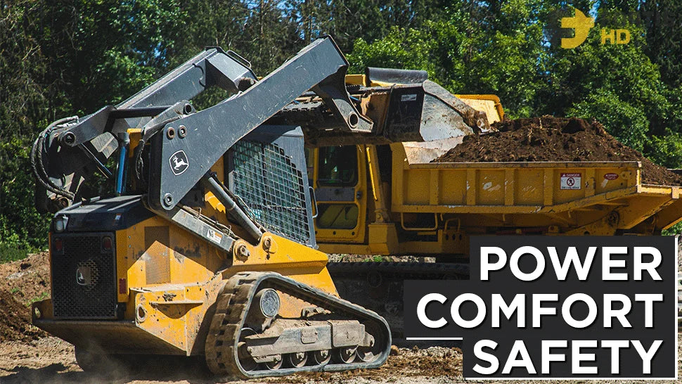 Both highlight the unrivaled lifting capacity, great breakout force, and versatility of the John Deere track loader with its many attachments.