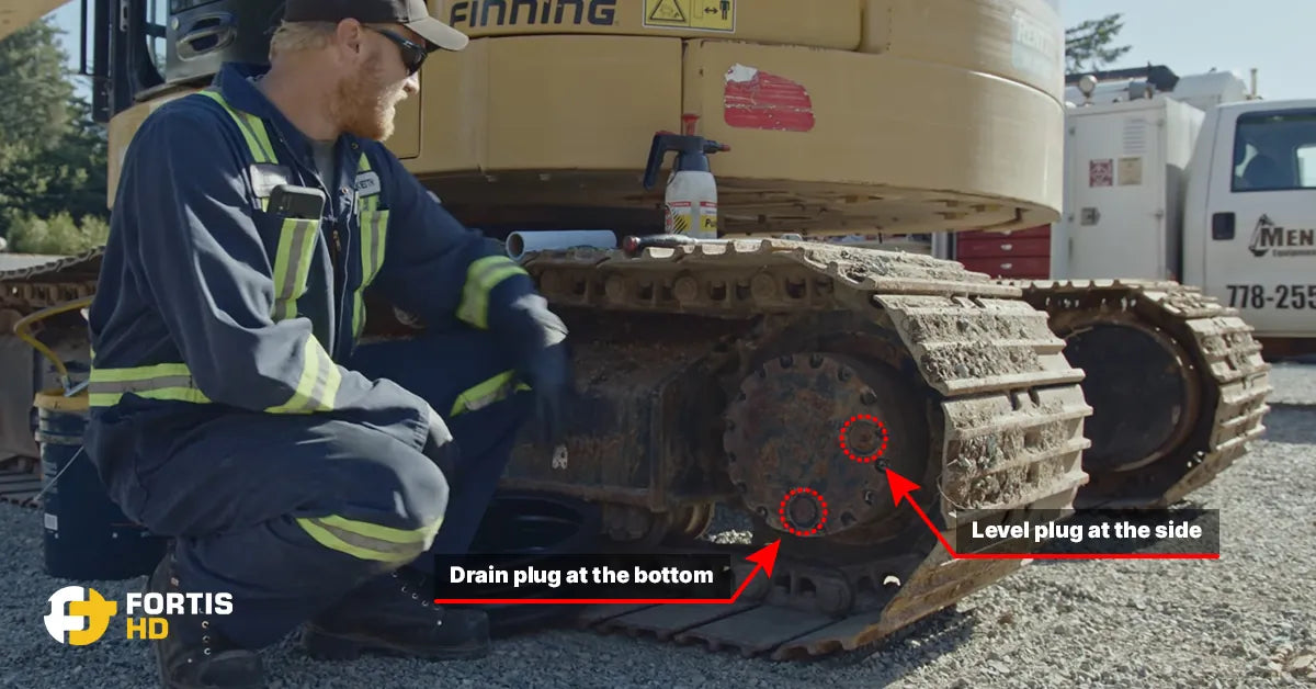 Some machines, including the CAT 314E, share the same level and fill plug. You must pump oil through the top fill hole for models with three-plug final drives.