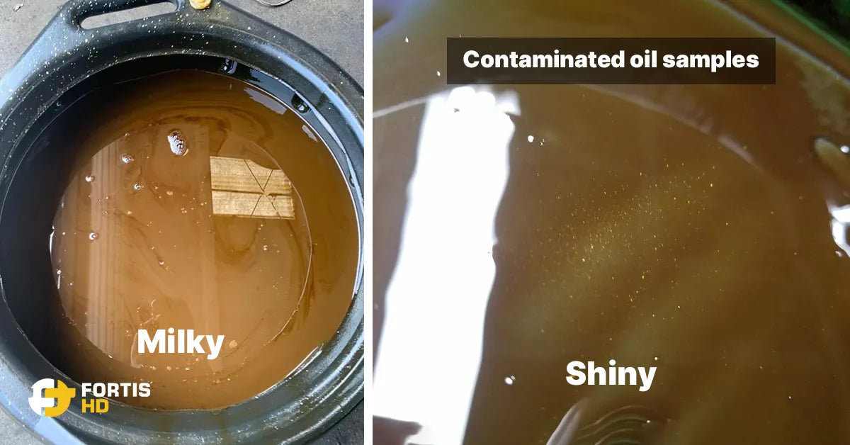 A contaminated oil will appear shiny or milky. Metal filings or shavings make the oil look shiny, while water turns the oil into a milky mixture.
