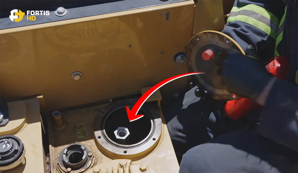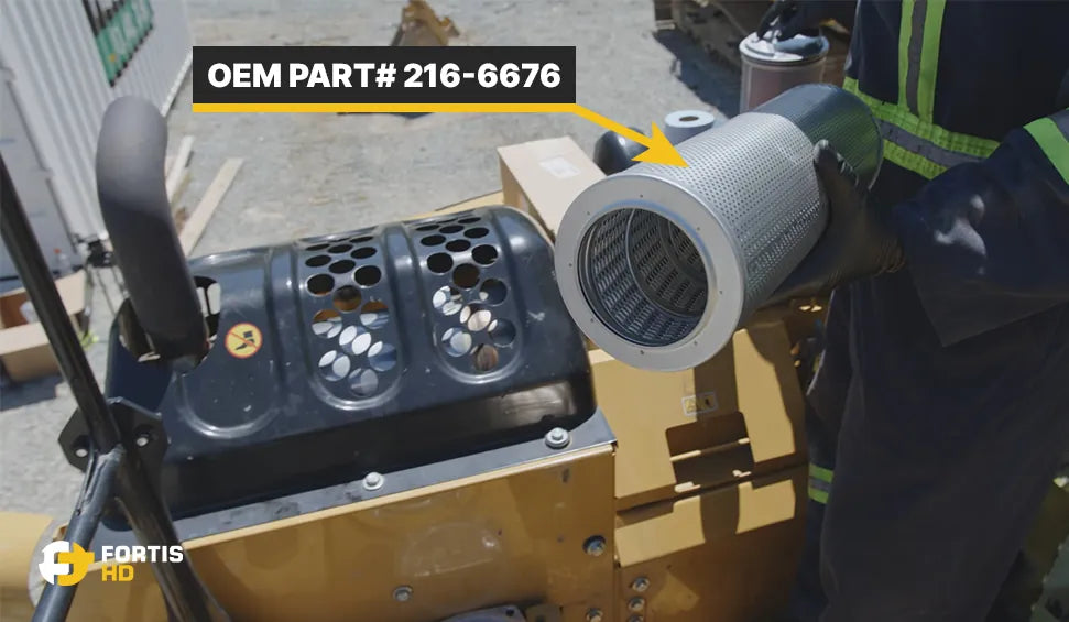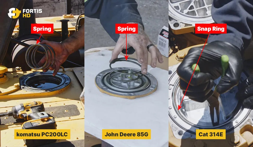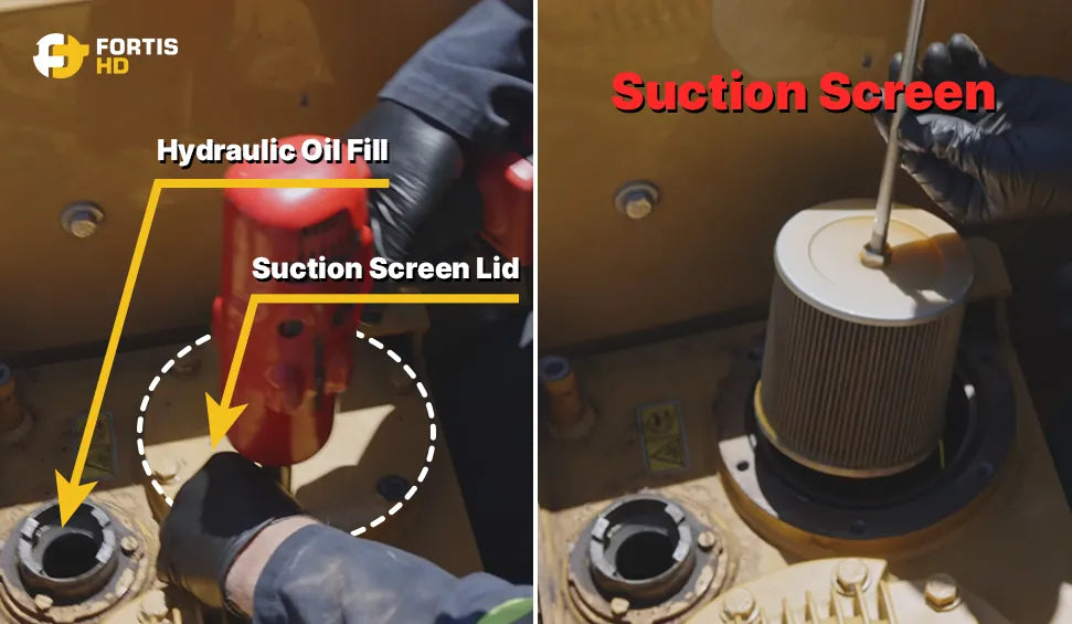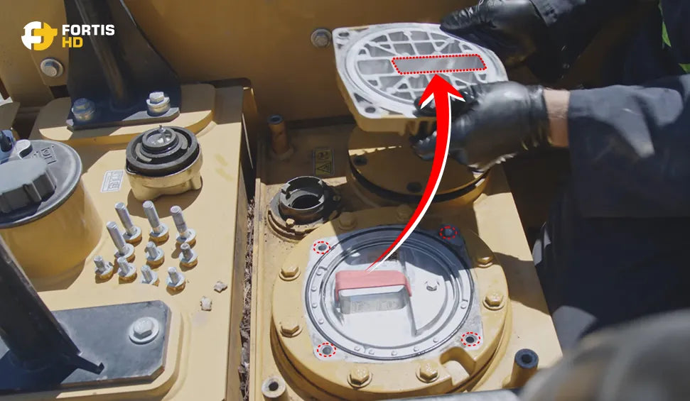 Remove the bolts from the hydraulic return filter cover. You’ll find a lid with a handle and a snap ring that holds it in place. Most CAT models have that design. A spring holds the return filter on machines like the John Deere 85G and the Komatsu PC200LC.