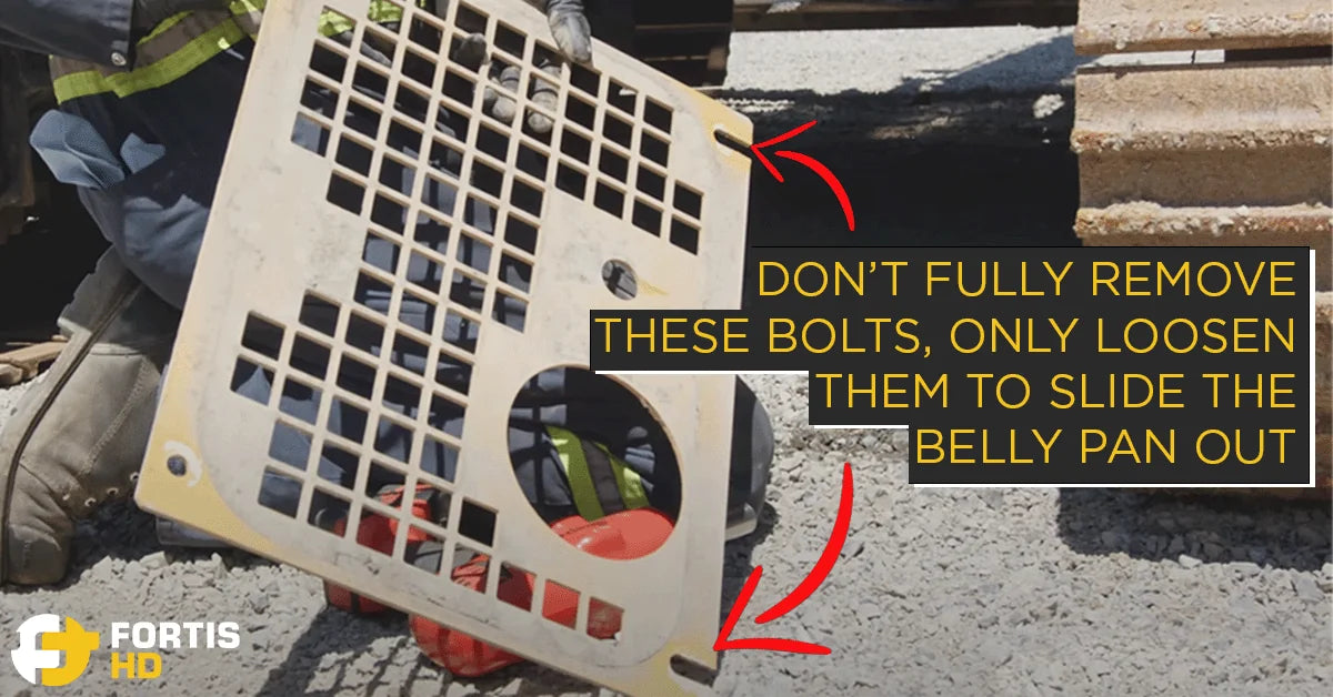 Just loosen the bolts from the slotted holes and remove the others. Then, you can slide the belly pan out to remove it and follow the same steps for installation, instead of holding the pan while trying to put the bolts back in.