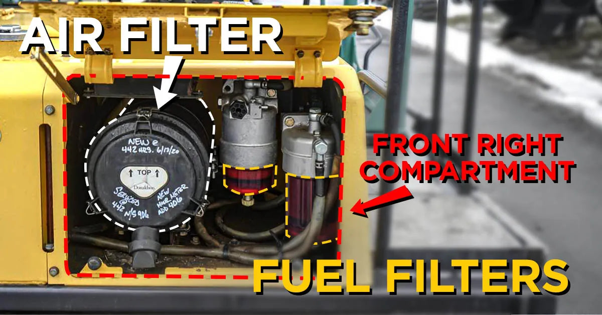 The air filter (and fuel filters) are in the machine’s front-right compartment. Release the three latches to remove the housing cover.
