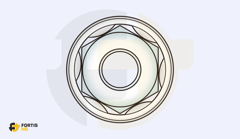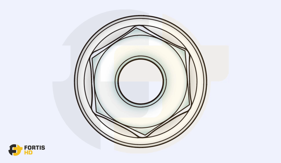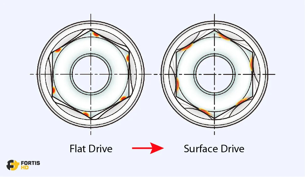 The flat drive design aims to prevent the fastener from getting rounded while delivering a higher torque application by moving the torque contact area away from the fastener corners, its weakest structural point.