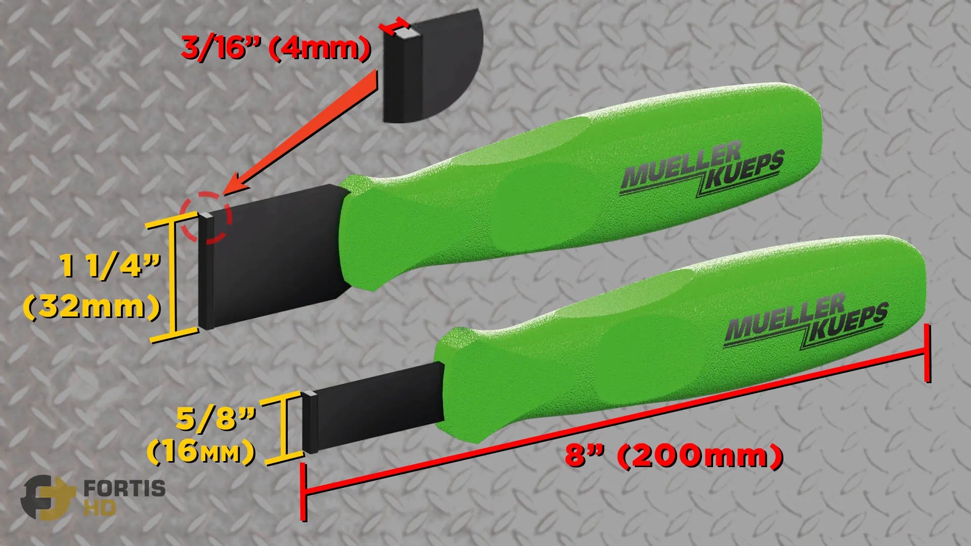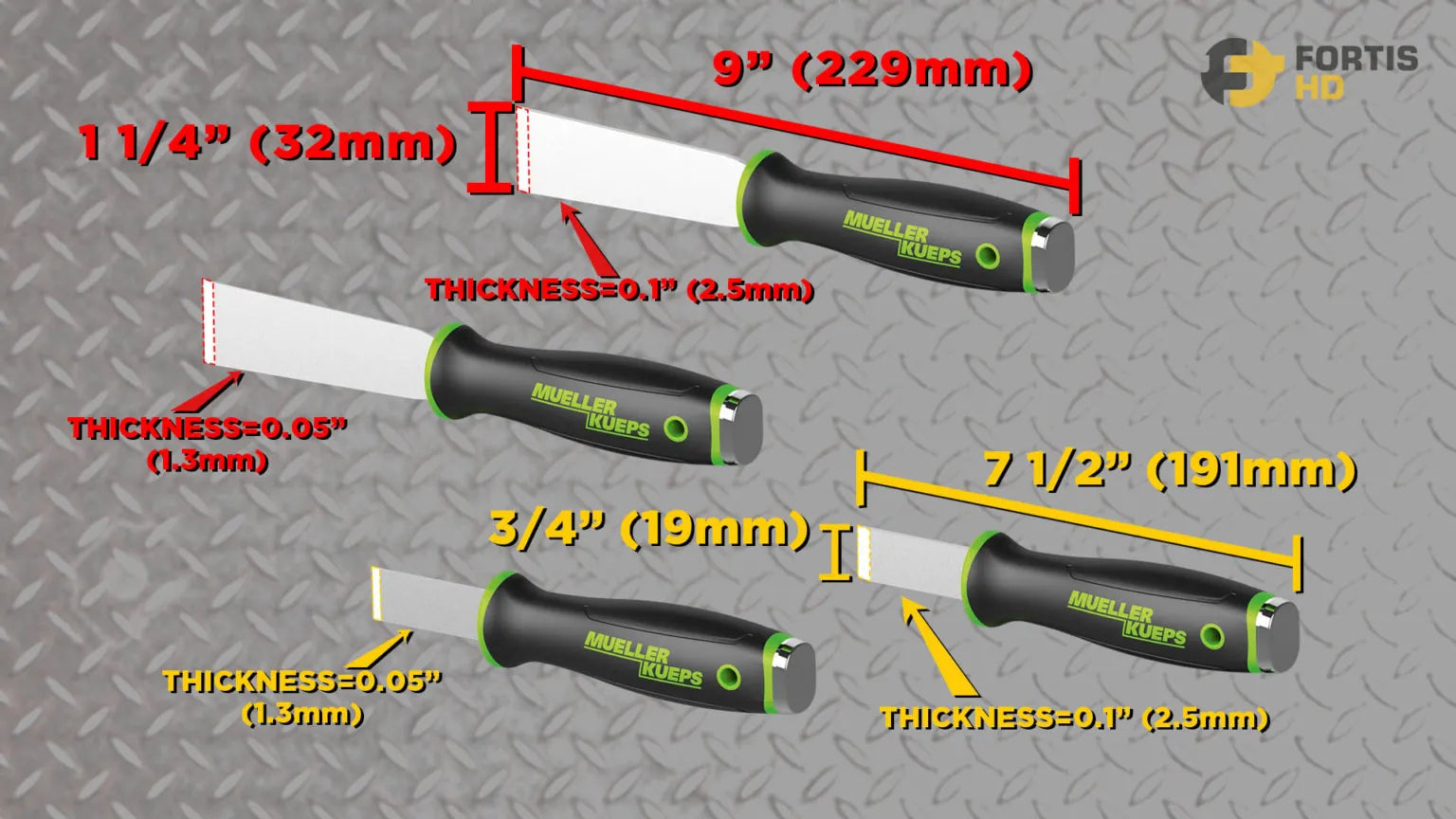 The chisel scraper kit comes with flexible (more like a putty knife) and beefy blades. Their striking caps and stainless steel blade running through the handle will let you take the most out of these chisels.