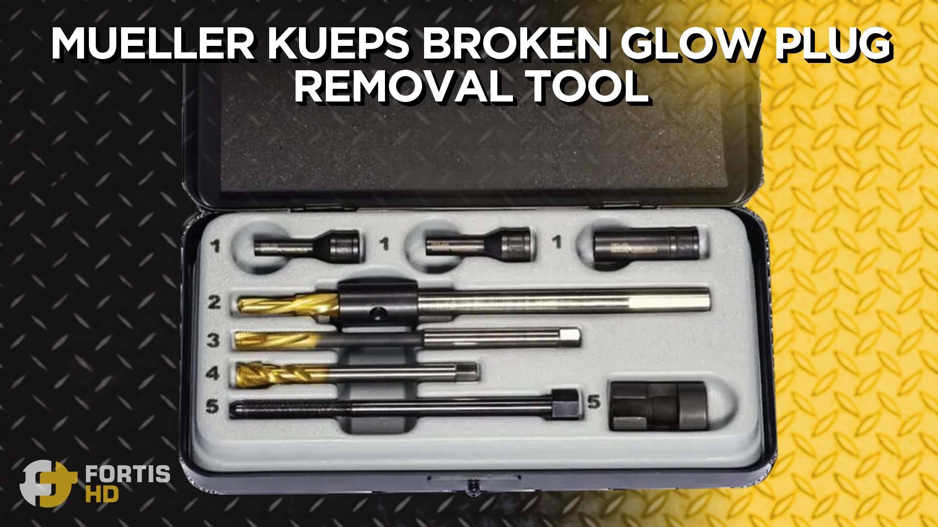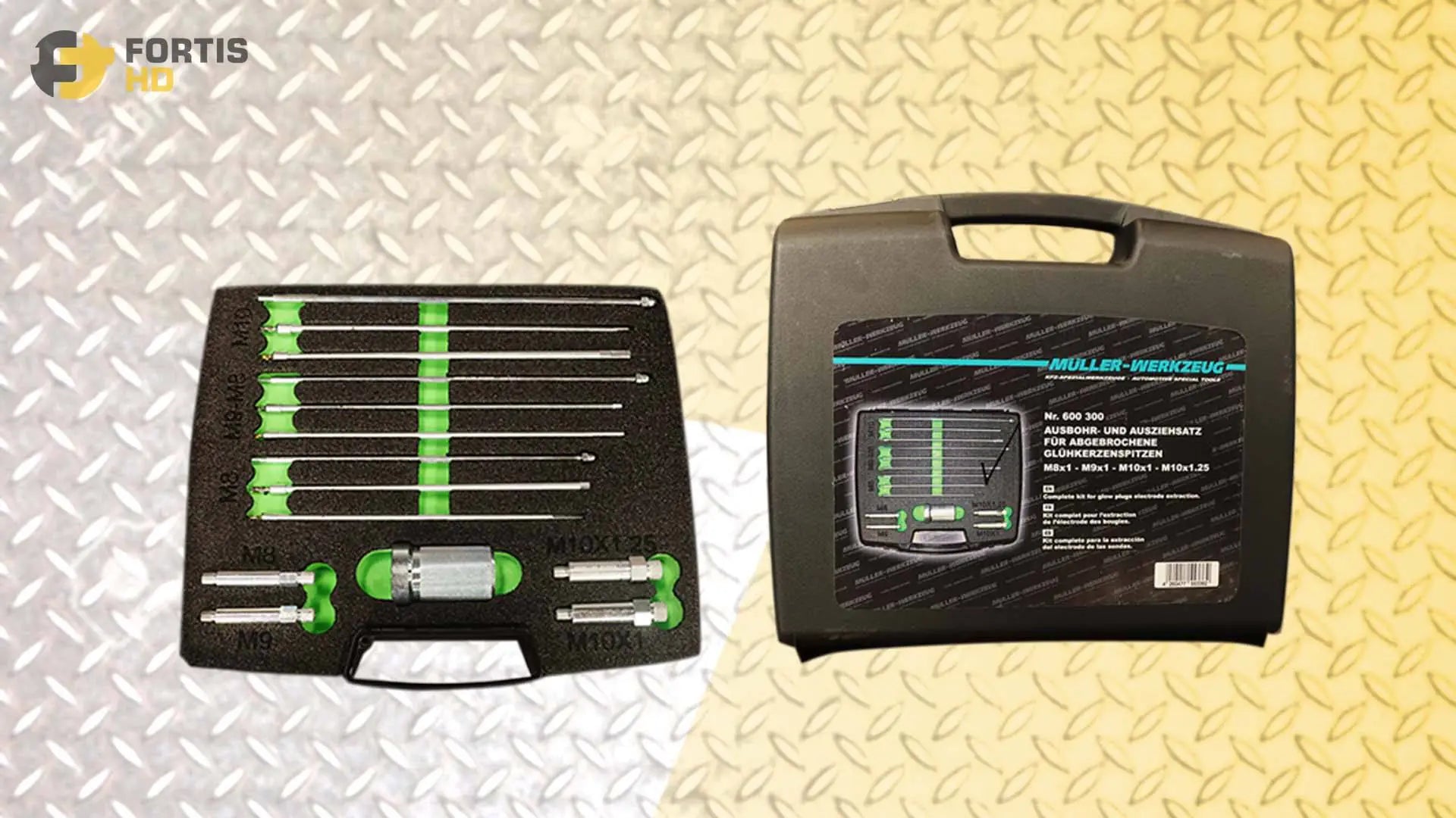 The kit can remove stuck, broken tips of M10x1, M10x1.25, M9x1, and M8x1 glow plugs. It comes with the following tools: