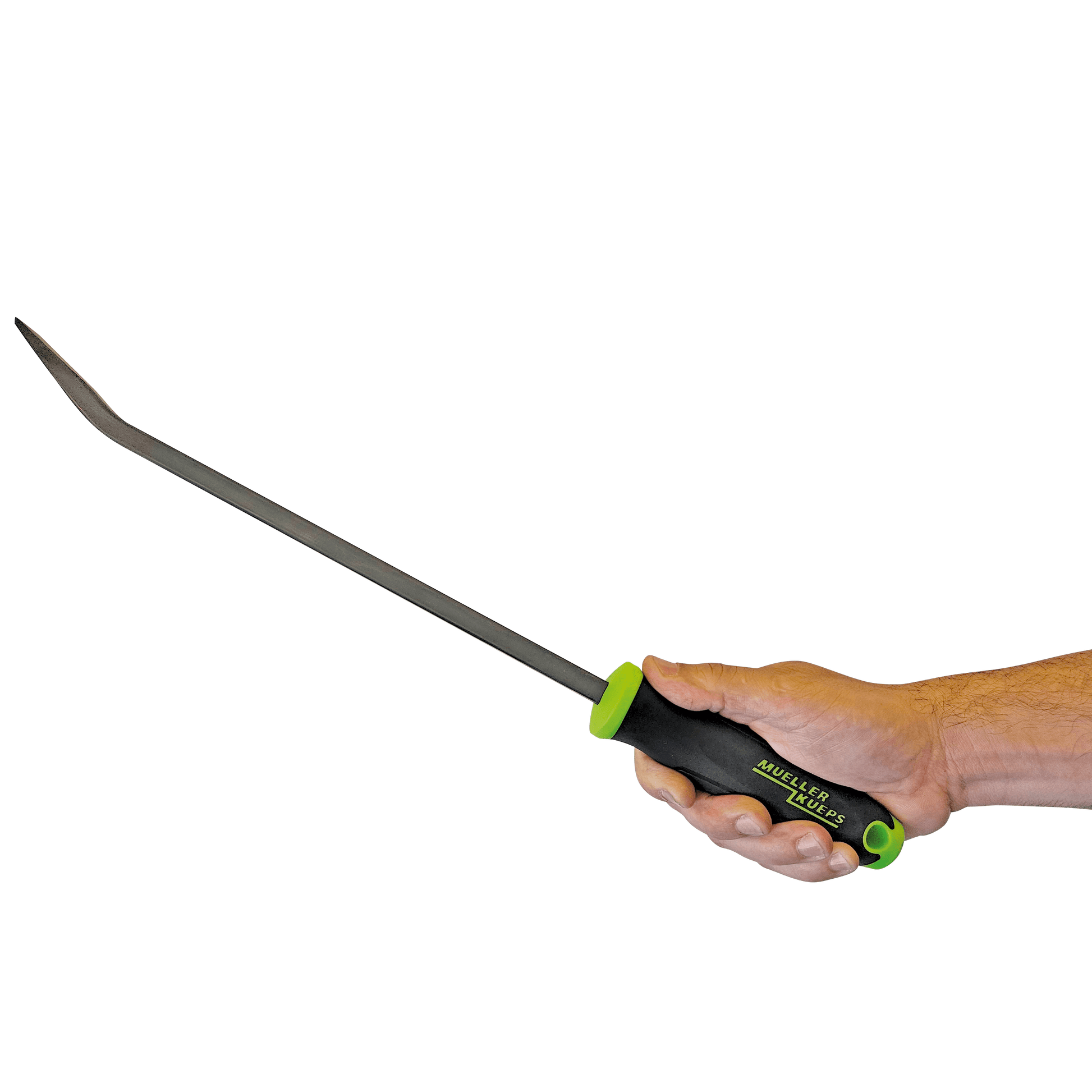 - Seat the angled tip under the part; keep the handle aligned with the intended lift.